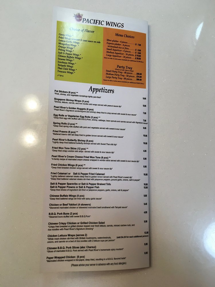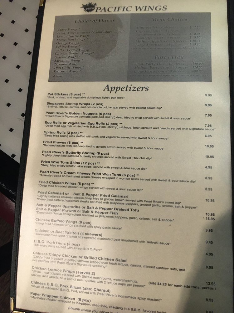 6 pieces. Pearl River's signature wontons (pork and shrimp) deep fried to crisp, served with sweet and sour sauce.